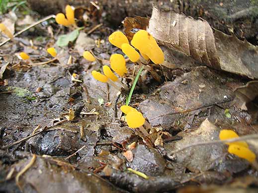 Der Pilz des Jahres 2023 ist der Sumpf-Haubenpilz (Mitrula palodosa Fr.). Er ist ein Ascomycet, d.h. ein Schlauchpilz, aufgrund der Fortpflanzungsstruktur der schlauchförmigen Asci. Der Fruchtkörper ist gestielt und der Oberteil birnen- bis keulenförmig. Der Stiel ist dünn, hohl und weißlich bis bräunlich gelb. Der obere Teil ist gelb bis orange. Er ist in ganz Europe verbreitet. Man findet ihn verrottendem Laub und Holzstücken, in Wald- und Moorgräben, Quellsümpfen und weiteren Nassstandorten vor. In Tümpeln und Gräben ragen oft nur die Köpfchen aus dem Wasser. Als geselliger Pilz findet man ihn, wo er vorkommt, sehr häufig. Der Sumpf-Haubenpilz ist ungenießbar.